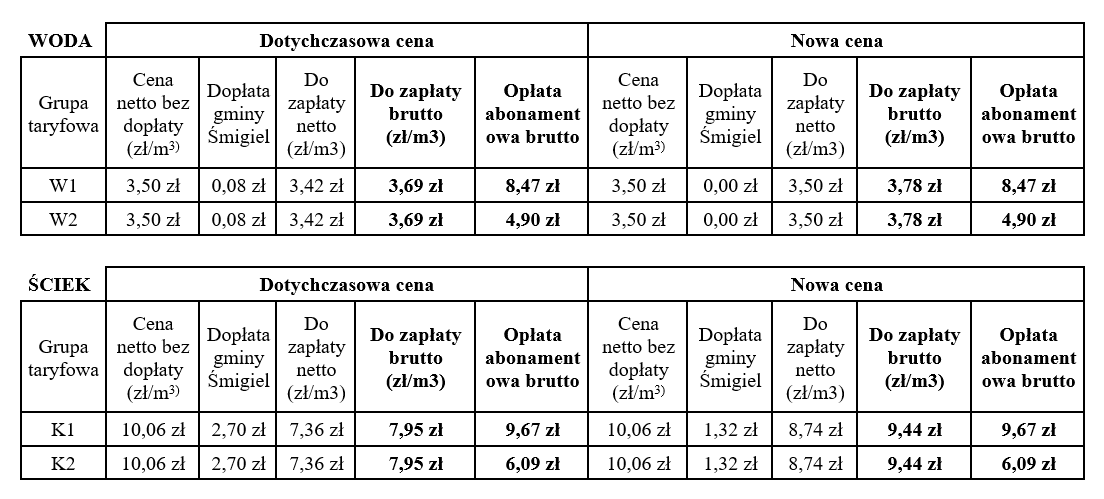 Podczas sesji Rady Miejskiej Śmigla w dniu 29.12.2022 r. została podjęta uchwała w sprawie dopłat do taryfowej grupy odbiorców usług w zakresie zbiorowego odprowadzania ścieków. Biorąc pod uwagę obecną sytuację gospodarczą Rada podjęła uchwałę o wprowadzeniu dopłaty w wysokości 1,32zł (netto) do 1m³ odprowadzanych ścieków dla grup taryfowych K1-K3. Ustalona dopłata będzie obowiązywała w okresie od 1 stycznia 2023r. do 31 grudnia 2023r.
